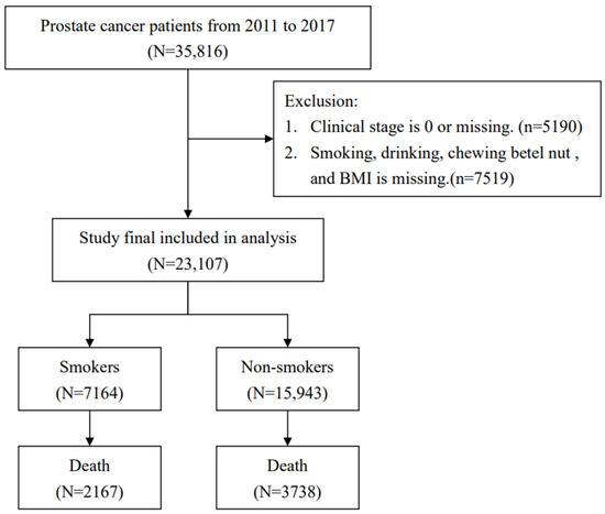 - Foerster, B.; Pozo, C.; Abufaraj, M.; Mari, A.; Kimura, S.; D’Andrea, D.; John, H.; Shariat, S.F. Association of Smoking Status With Recurrence, Metastasis, and Mortality Among Patients with Localized Prostate Cancer Undergoing Prostatectomy or Radiotherapy: A Systematic Review and Meta-analysis. JAMA Oncol. 2018, 4, 953–961. [Google Scholar] [CrossRef] [PubMed]