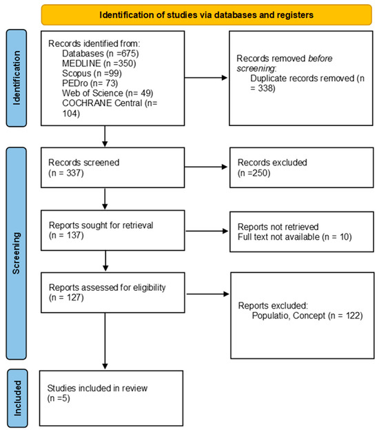 As presented in the PRISMA 2020 flow diagram (Figure 1), from 675 records identified by the initial literature searches, 670 were excluded, and 5 articles were included (Table 1, Table 2 and Table 3). The quality of the studies was assessed with the PEDro scale (Table 3) and ROB2 (Table 3).