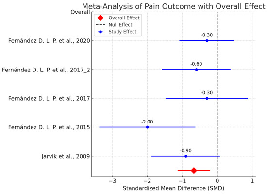 Overall, manual therapy appeared to offer superior short-term pain relief compared with surgery, but the long-term outcomes (12 months and beyond) showed no significant difference between the two interventions. A meta-analysis was conducted to compare the effects of manual therapy versus surgery on pain reduction across the included studies. The combined effect size (Standardized Mean Difference (SMD)) was −0.67 (95% CI: −1.12 to −0.22), indicating a significant reduction in pain, favoring manual therapy. The forest plot in Figure 2 illustrates the individual and overall effects across the studies (Figure 2).