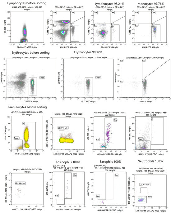 Erythrocytes, monocytes, lymphocytes, neutrophils, basophils, and eosinophils from peripheral blood were sorted using fluorescence-activated cell sorting. Verification of the sorted cell populations’ purity.