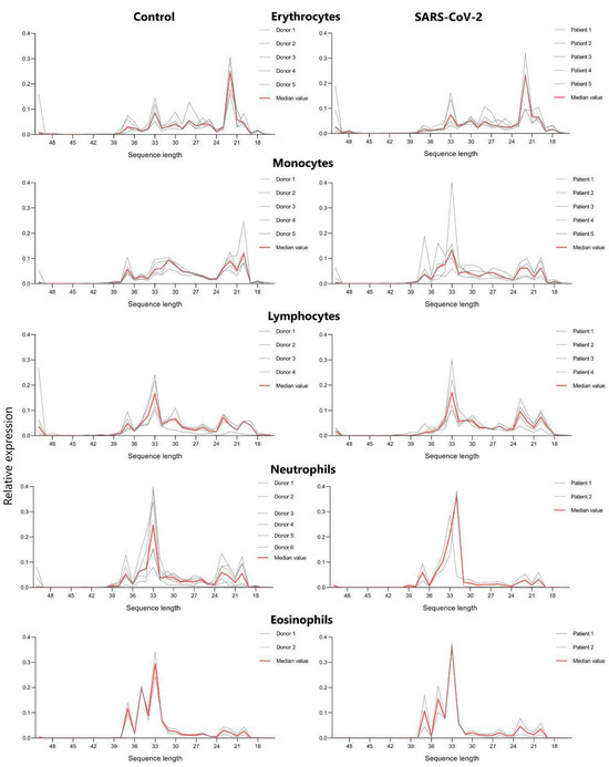 Analysing tRFs’ length distribution, we observed a certain similarity between control and severe COVID-19 patients’ erythrocytes, lymphocytes, eosinophils and basophils (Figure 3). In the results, we demonstrate the characteristics of length distribution spikes in monocytes and neutrophils, which seem to be altered in comparison to the aforementioned cell types. Monocyte control cells demonstrate high spikes at 31, 22 and 20 nucleotides, whilst the monocytes of SARS-CoV-2-infected patients demonstrate a dominant major spike at 33 nucleotides. In neutrophils, we observed a major spike at 33 nucleotides in control cells and a major spike at 32 in the cells of SARS-CoV-2-infected patients. It is important to state how lymphocytes, one of the key players in the cytokine storm, demonstrate no significant differences in tRF length or tRF types (Figure 3 and Figure 4).