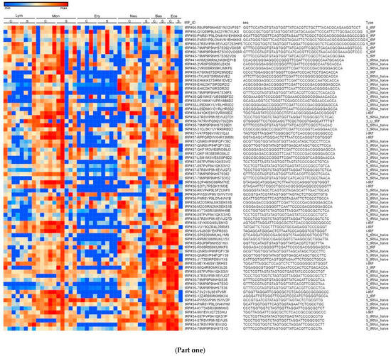 Overlooking tRF expression data on our heatmap (Figure 5), we noticed a distinguishable pattern of tRF expression which differs depending on cell type. Erythrocytes are presented as the most distinguishable group of cells in terms of tRF length and tRF expression patterns, which may be due to the fact that the erythrocyte is an inactive cell in terms of synthetic processes. It is worth noting how the expression is increased in the majority of tRFs in granulocytes (neutrophils, basophils, eosinophils). A similar tendency towards increased expression is observed in monocytes. Granulocytes and monocytes both originate from CFU-GM (Colony Forming Unit–Granulocyte–Macrophage), also known as the granulocyte–macrophage progenitor (GMP) [15]. The aforementioned finding suggests that tRFs may dominantly persist from the progenitor stages of cell development and are only slightly modified by environmental or physiological factors.