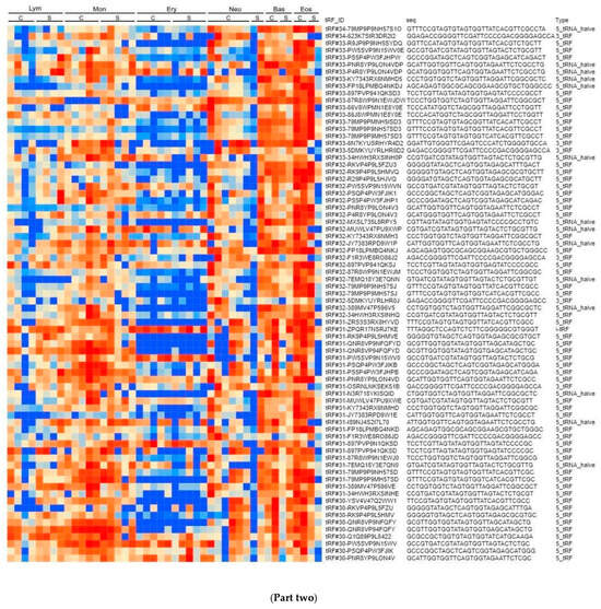 (Part one) tRF expression in control donors (C) and severe COVID-19 (S) patients. (Lym—lymphocytes, Mon—monocytes, Ery—erythrocytes, Neu—neutrophils, Bas—basophils, Eos—eosinophils). (Part two) tRF expression in control donors (C) and severe COVID-19 (S) patients. (Lym—lymphocytes, Mon—monocytes, Ery—erythrocytes, Neu—neutrophils, Bas—basophils, Eos—eosinophils).