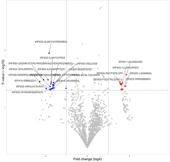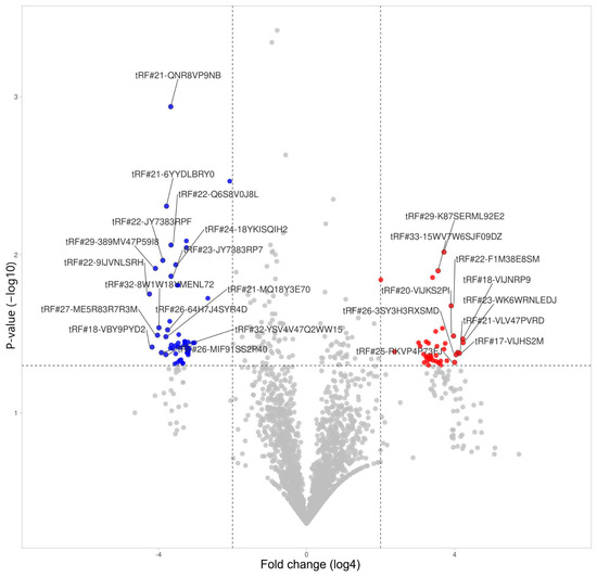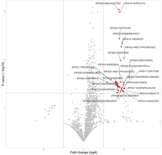 tRF differential expression in erythrocytes (For all volcano plots, we applied log4 (instead of log2) for fold change presentation).