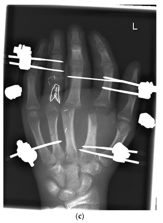 (a) Preoperative wound with exposed bone defect at MCP II–IV. (b). Preoperative X-ray with the destruction of MCP II–IV. (c) X-ray after the first surgical treatment using external fixators.