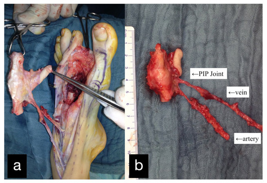 (a) Intraoperative PIP-Joint of the left second toe. (b) Explanted PIP-Joint of the left second toe with vein, artery, and skin island.