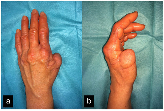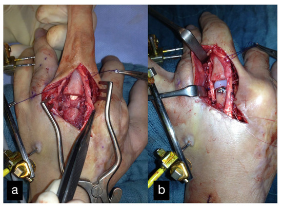 MCP joint of the middle finger before (a) and after (b) reconstruction using an MCP endoprosthesis.