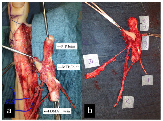 (a) Intraoperative PIP and MTP joints of the right second toe and first dorsal metatarsal artery and vein (FDMA + vein). (b) Explanted PIP and MTP joints with the tendon (T), artery (A), vein (V), and skin island.