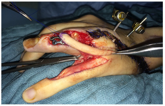 - Whitney, T.M.; Lineaweaver, W.C.; Buncke, H.J.; Nugent, K. Clinical results of bony fixation methods in digital replantation. J. Hand Surg. 1990, 15A, 328–334. [Google Scholar] [CrossRef]