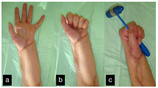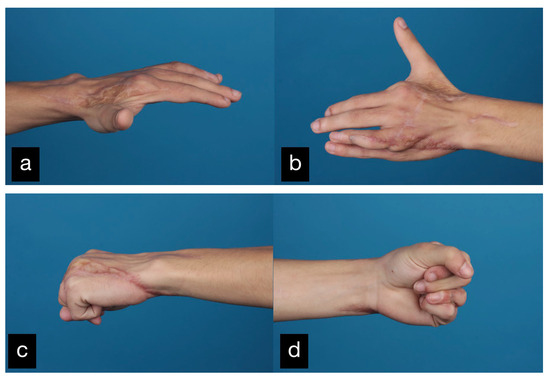 In a follow-up 3 months after the initial treatment, the patient stated that he was gradually coping with daily life and that he was able to open a lock with a key and eat independently with a knife and fork. The clinical examination showed very good mobility of the MCP joints with a deficit in extension of 25° and a possible flexion of 80 ° (Figure 14).