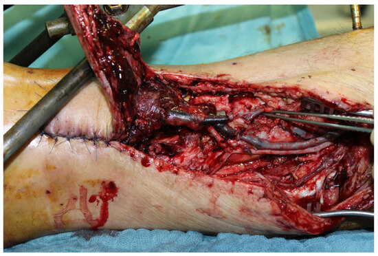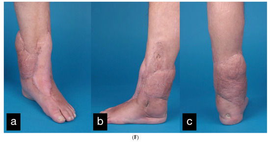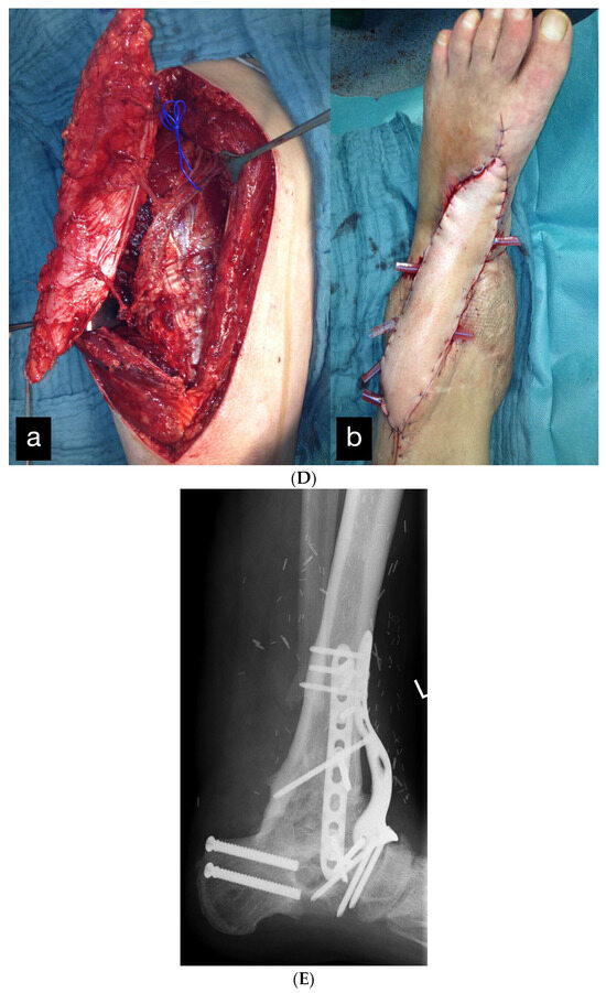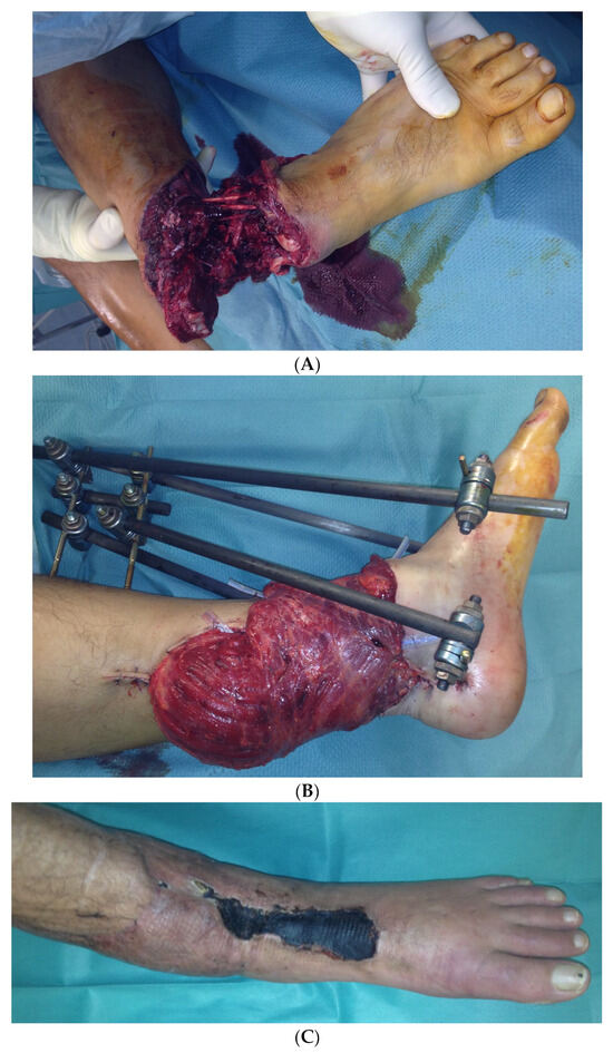 During the initial treatment, the anterior tibial artery was sutured using a vein interposition graft, four veins were supplied with an interposing suture, an anterior and posterior tibial tendon suture, and an external fixator attached to the left ankle, as well as a temporary soft tissue covering with alloplastic material. Five days after the accident, the soft tissues were covered with a free latissimus dorsi flap (Figure 10B).