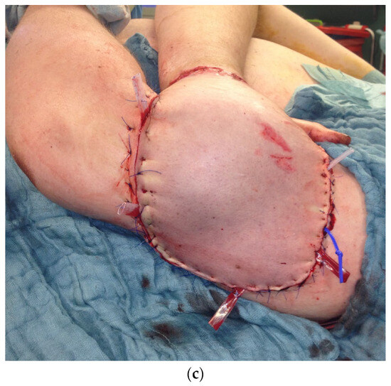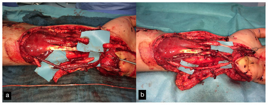 Because the peeled-off soft skin tissue was not suitable for replantation, a Colson-plastic was performed. The right hand was placed in the left upper arm (Figure 12a,b). Due to an existing obesity, the patient decided against a groin flap and in favor of positioning the hand on the upper arm.