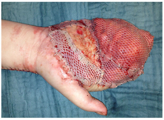 Serratus fascia flap with split-thickness skin grafts on the palm of the hand.