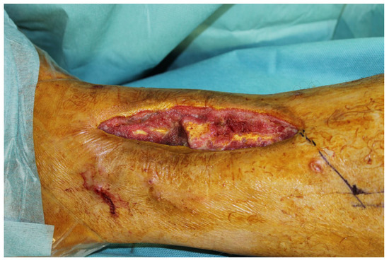 In the second case, a 45-year-old male patient was hit on the left lower leg by a steel beam. The partial amputation was only held by the tendons of the M. tibialis anterior and the Achilles tendon on the lower leg (Figure 10A). The subtotal lower leg amputation showed no peripheral blood flow, sensitivity, or motor function.