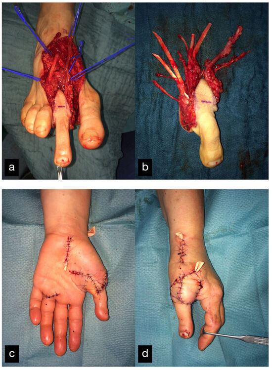 - Kanaya, K.; Wada, T.; Usui, M.; Yamashita, T. Fourteen-year results of a reversed vascularized second metatarsophalangeal joint transfer: A case report. J. Hand Surg. Am. 2005, 30, 120–124. [Google Scholar] [CrossRef]