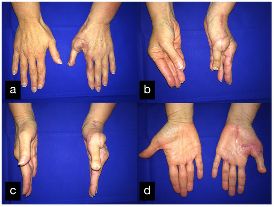 Several techniques have been developed in order to achieve the goal of the recreation of a near-normal function [26,27]. Some techniques to treat destructed joints are arthrodesis, osteochondral grafting [28], costal cartilage grafts [29], perichondrial resurfacing [30,31], silicone arthroplasty [32,33], and endoprosthesis [33,34]. The incidence of tendon surgery is the highest.