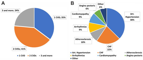 Approximately half of the SLE patients had various comorbid CVDs. The structure of the comorbid CVDs in the SLE patients is presented in Figure 1. About one-third of the patients had only one CVD, 41% of the patients had two CVDs, and 24% suffered from three or more cardiovascular pathologies (Figure 1A). Among the defined CVDs, arterial hypertension was the most common, in particular 12 patients out of 17 suffered from this comorbid pathology (Figure 1B). CHF occurred in 22% of patients. Other comorbid conditions such as atherosclerosis, arrhythmias, cardiomyopathies, angina pectoris, and others were even less common. Data on the specific CVDs for each SLE patient are presented in Supplementary Table S1.
