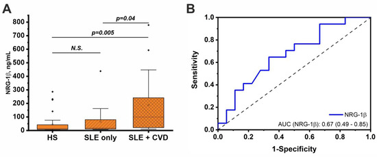 Serum concentrations of NRG-1β in healthy individuals and SLE patients with and without CVDs (A). The significance of the differences was assessed using the Kruskal–Wallis test with Dunn’s post hoc test. (B) ROC curve reflecting the quality of binary classification of SLE patients with and without CVDs based on NRG-1β level.