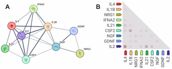 The cytokines and growth factors correlating with each other were selected for a protein–protein and functional interaction analysis and co-expression analysis (Figure 5). The cytokines and growth factors were shown to have functional and protein–protein interactions (Figure 5A). The cytokines formed a large network and were functionally associated with each other. IL-1β, IL-2, and IL-4 had marked functional relationships. The growth factors (GDNF, NGFβ, NRG-1β, and GM-CSF) were functionally interconnected with each other. NGFβ, GDNF, and especially GM-CSF were also associated with cytokines. NRG-1β was functionally associated only with growth factors (GDNF and NGFβ) but not with cytokines.