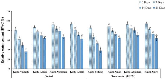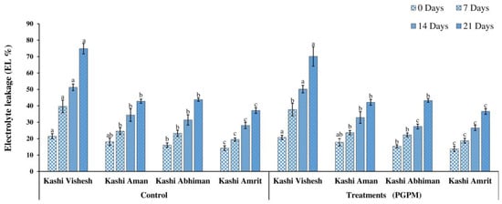 The relative water content (RWC) decreased with the prolongation of the water deficit, and the maximum reduction was detected after 21 DWD in all varieties. The RWC of all the varieties was significantly improved with the PGPM treatment. The maximum reduction recorded in Kashi Vishesh was 36.03% without PGPM after 21 DWD, while it was 70.19% in the case of Kashi Abhiman with PGPM (Figure 1). EL increased after 7, 14, and 21 DWD in both non-treated and treated plants. The order of EL under the control condition, without PGPM treatment, was as follows: Kashi Vishesh > Kashi Aman > Kashi Abhiman> Kashi Amrit, and a similar order was observed in PGPM-treated plants. EL recorded a maximum after 21 DWD in Kashi Vishesh (51.29%) and a minimum in Kashi Amrit (28.01%), and the order for non-treated plants was as follows: Kashi Vishesh > Kashi Abhiman> Kashi Aman > Kashi Amrit. A similar order was recorded under PGPM-treated conditions (Figure 2).