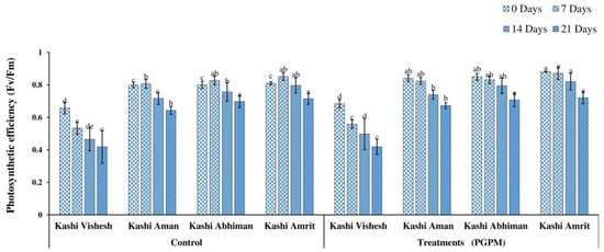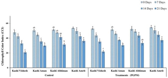 Fv/Fm reduced with the increase in DWD, with the maximum value (0.850) under the control condition and the minimum (0.419) value after 21 DWD. The trend of control plants was Kashi Amrit > Kashi Abhiman > Kashi Aman > Kashi Vishesh, while the trend for PGPM-treated plants was Kashi Amrit > Kashi Abhiman > Kashi Aman > Kashi Vishesh. However, after 21 DWD, similar to the trend noted for the control plants, the same trends were also recorded for PGPM-treated plants (Figure 3). Similar to Fv/Fm, reductions in CCI were also recorded, and the reduction was maximum after 21 DWD. Under the control condition, the maximum CCI was recorded in Kashi Amrit (53.33), while it was lowest in Kashi Vishesh (47.66). The PGPM treatment significantly improved the CCI: it was minimum in Kashi Aman (51.33) and maximum in Kashi Amrit (54.33). Although, after 21 DWD, it was 20.66 (Kashi Vishesh) and 36.12 (Kashi Amrit) in control plants, while it was 21.66 (Kashi Vishesh) and 37.11(Kashi Amrit) in PGPM-treated plants (Figure 4).