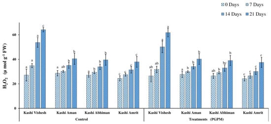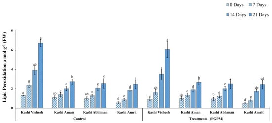 The H2O2 ranged from 24.23 to 64.16 (µ mol g−1 (FW)) and increased after 7, 14, and 21 DWD in both control and PGPM treated Kashi Vishesh, Kashi Aman, Kashi Abhiman, and Kashi Amrit plants. H2O2 was at a minimum of 24.23 (µ mol g−1 (FW)) in Kashi Amrit under the control and PGPM-treated conditions, while it was at a maximum of 28.66 and 27.71 (µ mol g−1 (FW)) for Kashi Aman. The highest H2O2 was recorded at 64.16 and 61.78 (µ mol g−1 (FW)) for Kashi Vishesh under the control and PGPM-treated conditions (Figure 5). The LPO concentration increased from 0.538 to 3.916 (µ mol g−1 (FW), after 7, 14, and 21 DWD in Kashi Vishesh, Kashi Aman, Kashi Abhiman, and Kashi Amrit plants under the control and PGPM-treated conditions. Under the control condition, the maximum LPO (1.296 µ mol g−1 (FW)) was noted in Kashi Vishesh (control), and the minimum (0.503 µ mol g−1 (FW)) in Kashi Amrit with PGPM treatment (Figure 6).