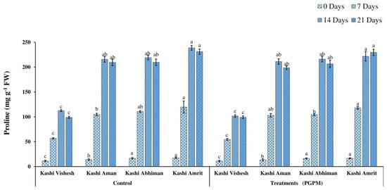 In both the control and PGPM-treated conditions in Kashi Vishesh, Kashi Aman, Kashi Abhiman, and Kashi Amrit, the proline level increased (11.29 to 118.1 mg g−1 FW) up to 7 and 14 DWD, and decreased after 21 DWD. Under the control condition, the maximum proline level noted in Kashi Amrit control plants was 17.34 mg g−1 FW, while a minimum level of 11.11 mg g−1 FW was noted in Kashi Visheshcontrol plants. Although, a maximum proline level of 238.7 mg g−1 FW was recorded in Kashi Amrit control plants after 14 DWD (Figure 7).