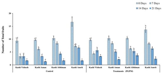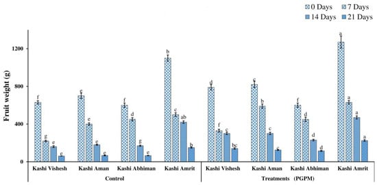 Reductions in the numbers of fruit (16.66–1.33) and the fruit weights (1100–60.33 g) were recorded after 7, 14, and 21 DWD in all varieties under control and PGPM-treated conditions. Under 0 DWD in control plants, the maximum number of fruits (16.66) was recorded in Kashi Amrit and the minimum in Kashi Vishesh (9.33). However, the maximum fruit weight of 1270 g was recorded in Kashi Amrit PGPM-treated plants, and the minimum of 600.6 g in Kashi AbhimanPGPM-treated plants. Although, after 21 DWD, fruit number was the highest (3.66) in Kashi Abhiman PGPM-treated plants and the lowest (1.333) in Kashi Aman control plants (Figure 8). Similarly, after 21 DWD, the maximum fruit weight (225.3 g) was recorded in Kashi Amrit PGPM-treated plants, and the minimum fruit weight-(60.33 g) was recorded in Kashi Vishesh control plants (Figure 9).