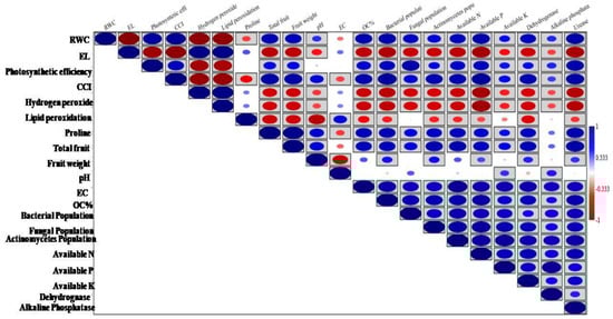 A correlation study among the parameters was performed to study their relationship. Most of the studied parameters showed significant correlation, either positive or negative. The RWC showed a significantly positive correlation with all the parameters, except EL, hydrogen peroxide, lipid peroxidation, and proline. EL showed a significantly negative correlation with all the parameters, except hydrogen peroxide, lipid peroxidation, proline, and EC (Figure 10). Similarly, EC, OC%, bacterial, fungal, and actinomycetes populations, available N, P, and K, and dehydrogenase and alkaline phosphatase levels were significantly positively correlated with OC%, bacterial, fungal, and actinomycetes populations, available N, P, and K, and dehydrogenase and alkaline urease levels.