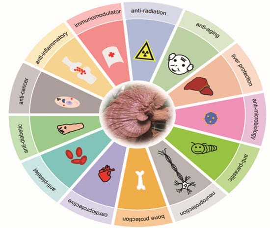 Ganoderic acids (GAs), as the main component of triterpenes in G. lucidum, are highly oxidized lanostane-type triterpenes, including ganoderic acid A (GA-A), ganoderic acid B (GA-B), ganoderic acid C (GA-C), ganoderic acid DM (GA-DM), ganoderic acid D (GA-D), ganoderic acid T (GA-T), and others [,]. Statistical evidence indicates that the main functions of GAs include anti-cancer, anti-inflammatory, immunomodulator, anti-radiation, anti-aging, liver protection, anti-microbiology, anti-parasitic, neuroprotection, bone protection, cardioprotective, anti-platelet, and anti-diabetes activities [,,,,,,,,,,] (Figure 1).