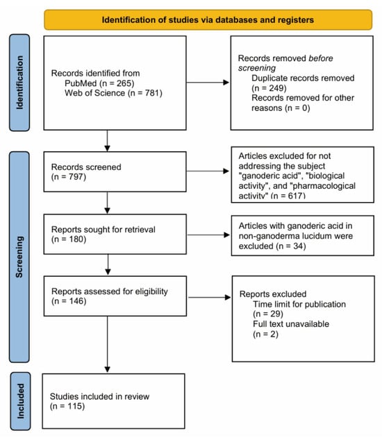 This review provides an overview of the research progress on GAs by summarizing experimental papers published over the past 5 years (from 2020 to 2024) using the PubMed and Web of Science databases with the keywords “ganoderic acids”, “biological activity”, and “pharmacological activity”. Additionally, it includes review articles published over the past decade (from 2014 to 2024) using the same databases with the keyword “ganoderic acids” (Figure 2). The primary objective is to provide a comprehensive synthesis of the existing literature on the biological activities and pharmacological mechanisms of these secondary metabolites, thereby providing a holistic and up-to-date perspective on the research directions in this specialized field. This work will accelerate the discovery of novel bioactive properties of GAs, revealing new horizons in the therapeutic potential of these compounds and laying the groundwork for the development of more effective and targeted therapeutic strategies against a wide range of diseases.