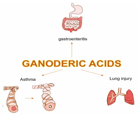 Inflammation is one of the most potent weapons of the immune system, which is initiated to eliminate inflammatory agents when the body encounters invasion by harmful organisms. It is an essential regulatory factor for maintaining homeostasis within the body. However, excessive or persistent inflammatory responses can promote the development of various chronic diseases []. There is substantial literature reporting the anti-inflammatory effects of Ganoderma polysaccharides, while studies on the anti-inflammatory effects of GAs are relatively scarce, such as in chronic gastrointestinal inflammatory diseases [], asthma [], and lung injury protection [,] (Figure 3). In recent years, exploration of the therapeutic potential of GAs for chronic inflammatory diseases has gradually increased [].