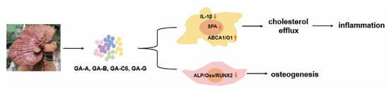 Atherosclerosis (AS) is a chronic inflammatory disease characterized by the infiltration of lipids and the formation of plaques in the walls of blood vessels. Through the application of mouse models and in vitro experimentation with macrophages, it has been revealed that GAs can preserve the stability of atherosclerotic plaques and elicit anti-atherosclerotic effects. This is achieved through the modulation of the TLR4/MyD88/NF-κB signaling pathway, which results in the inhibition of M1 macrophage polarization [,]. Subsequent studies further reveal that GA-A can inhibit inflammation and lipid deposition inhuman monocyte (THP-1) cells induced by oxidized low-density lipoprotein (ox-LDL) through the Notch1/PPARγ/CD36 signaling pathway, providing theoretical guidance for the therapeutic application of GA-A in AS []. Furthermore, in Zheng et al.’s study, GA-A, B, C6, and G are found to promote cholesterol efflux mediated by ABCA1/G1, thereby inhibiting inflammation in macrophages, and to suppress the osteogenic function mediated by RUNX2 in vascular smooth muscle cells (VSMCs), thus alleviating atherosclerosis [] (Figure 4).