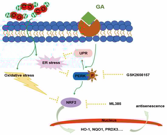 Aging is a significant risk factor for the development of many chronic diseases. The senescence and exhaustion of adult stem cells are considered hallmarks of organismal aging. Using a model of oxidatively stressed, senescent human amniotic mesenchymal stem cells (hAMSCs) induced by hydrogen peroxide in vitro reveals that GA-D delays hAMSC senescence by activating the endoplasmic reticulum kinase (PERK)/nuclear factor-erythroid 2-related factor (NRF2) signaling pathway []. In Yuan et al.’s study, it was further discovered that GA-D targets 14-3-3ε to activate the Ca2+ calmodulin (CaM)/CaM-dependent protein kinase II (CaMKII)/nuclear erythroid 2-related factor 2 (Nrf2) signaling pathway, thereby delaying the senescence of hAMSCs, with 14-3-3ε identified as a target of GA-D [] (Figure 5).
