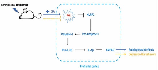 GA-A has been demonstrated to mitigate the inflammatory response in the hippocampus induced by post-stroke depression (PSD) by activating the ERK/CREB pathway, preventing pro-inflammatory (M1) polarization, and promoting anti-inflammatory (M2) polarization. This has been shown to reduce neuronal damage and depressive-like behaviors in PSD rats, as well as cerebral inflammation []. Moreover, it can treat mood disorders and inhibit depressive-like behaviors by modulating the bile acid receptor farnesoid X receptor (FXR), directly inhibiting the activity of the NLRP3 inflammasome, activating the phosphorylation and expression of AMPA receptors, and regulating synaptic activity [] (Figure 6). Additionally, in Xu et al.’s study, GA-A is found to exert antidepressant properties by affecting the expression of factors related to the regulation of mitochondrial activity and synaptic transmission signaling, providing a new perspective on the antidepressant effects of GA-A [].