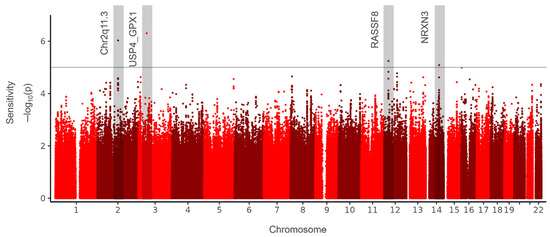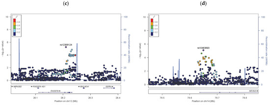 GWAS was performed to identify the genetic loci associated with 115 SS and 181 NS samples. GWAS results are illustrated in a Manhattan plot (Figure 1), which displays the distribution of p-values across the genome. Although no SNPs met the stringent genome-wide significance threshold (p < 5 × 10−8) given the limited number of participants with SS, four SNPs exhibited suggestive associations (p < 1 × 10−5) and are considered to be potential genes associated with SS. Genome construction of these SNP regions reflects signal plots around the major SNPs (Figure 2).
