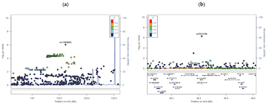 - Boughton, A.P.; Welch, R.P.; Flickinger, M.; VandeHaar, P.; Taliun, D.; Abecasis, G.R.; Boehnke, M. LocusZoom.js: Interactive and embeddable visualization of genetic association study results. Bioinformatics 2021, 37, 3017–3018. [Google Scholar] [CrossRef]