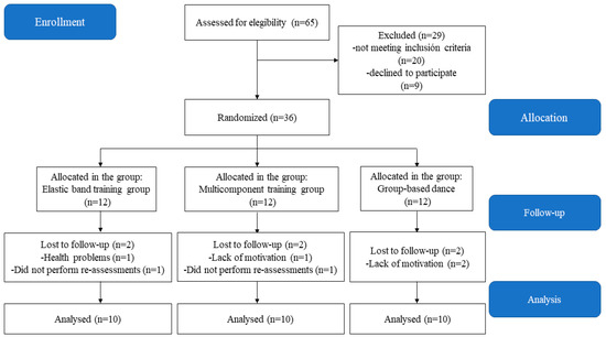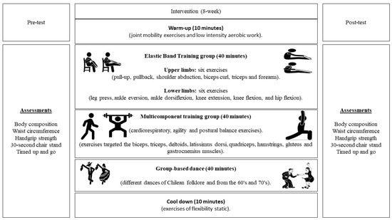 Hernandez-Martinez, J.; Guzmán-Muñoz, E.; Cid-Calfucura, I.; Villalobos-Fuentes, F.; Diaz-Saldaña, D.; Alvarez-Martinez, I.; Castillo-Cerda, M.; Herrera-Valenzuela, T.; Branco, B.H.M.; Valdés-Badilla, P. Elastic Band Training Versus Multicomponent Training and Group-Based Dance on Morphological Variables and Physical Performance in Older Women: A Randomized Controlled Trial. Life 2024, 14, 1362. https://doi.org/10.3390/life14111362