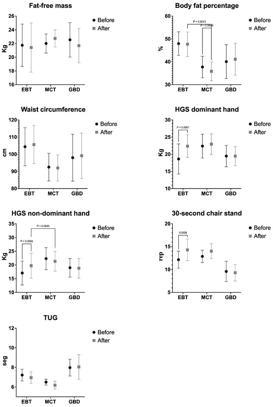 | Body fat percentage (%) | EBT | 48.0 | 5.2 | 47.7 | 5.3 | 0.027 * | 4.447 | 0.330 | Large effect |