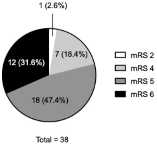 Clinical features and outcomes are summarized in Table 2 and Figure 1. The median GCS score was 6 (IQR, 4–13). The median hematoma volume was 99 (IQR, 55–167) mL, with 15.8% of the hematomas increasing in size prior to surgical removal. The most common location of the hematoma was the putamen (57.9%), followed by the lobar region (31.6%). Ventricular perforation was observed in 76.3% of the patients. The median intraoperative blood loss was 320 (IQR, 164–444) mL and 44.7% of the patients required intraoperative blood transfusion. Approximately half of the patients experienced perioperative complications. The most complications were rebleeding (10.5%), followed by seizures (7.9%), infection (7.9%), and severe cerebral edema (7.9%). A total of 30 patients (78.9%) had a very poor outcome, including 12 patients (31.6%) who died in hospital.
