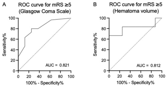 Receiver operating characteristic (ROC) curve for predicting very poor outcomes based on the Glasgow Coma Scale (GCS, (A)) and hematoma volume (B). The area under the curve was 0.821 and 0.812 for GCS and hematoma volume, respectively.