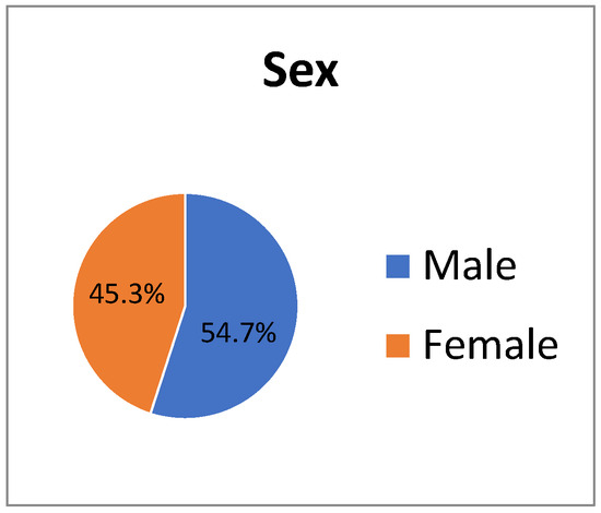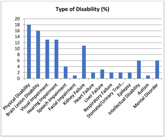 The study participants (n = 19,141) comprised 54.7% male and 45.3% female (Figure 1). The age distribution was as follows: 4.3% in their 10s, 6.2% in their 20s, 5.9% in their 30s, 11.6% in their 40s, 27.6% in their 50s, 35.4% in their 60s, and 9% in their 70s, with the largest group being those in their 60s. Regarding marital status, 23%were unmarried, 52% married, and 25% divorced/separated/bereaved. In terms of disability type, 17.4% had physical disability, 15.6% had brain lesion disability, 13.3% had visual impairment, 12.5% had hearing impairment, 4.3% had speech impairment, 0.5% had facial disability, 10.6% had kidney failure, 2.1% had heart failure, 3.6% had liver failure, 2.7% had respiratory failure, 2.5% had stomatal urinary tract disorder, 2.1% had epilepsy, 5.8% had intellectual disability, 1% had autism, and 6%had a mental disorder (Figure 2). Physical disabilities were the most prevalent type.