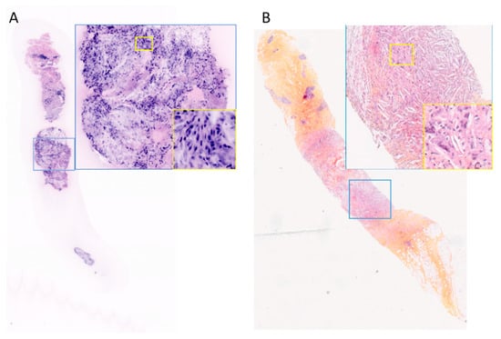 (A). Fresh tissue—FCM image not interpreted by PT2. (B). FFPE tissue—corresponding HES slide interpreted as inflammation by PT1, magnification ×15—blue inset magnification ×100 and yellow inset magnification ×400.