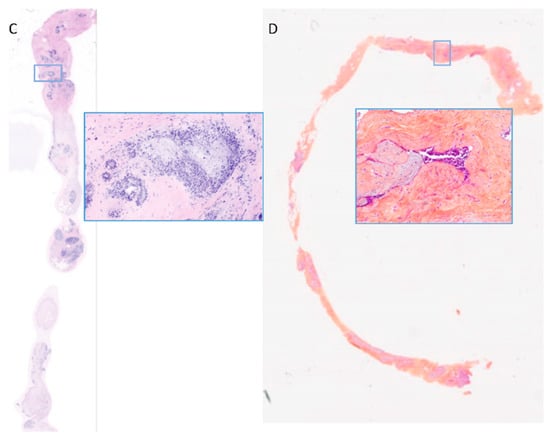 FCM images interpreted as suspicious (B4) by PT1 or PT2 (A). Fresh-tissue—papillary carcinoma. (B). FFPE tissue—corresponding histological section (C). Fresh tissue—Fibroadenoma (D). FFPE tissue—corresponding HES section. Magnification ×15—blue inset magnification ×100—yellow inset magnification ×200.