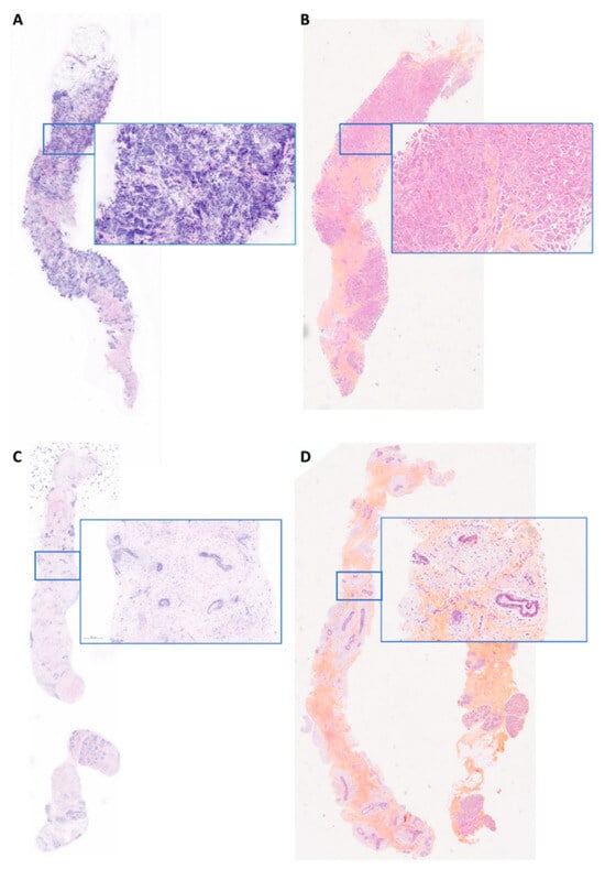 Examples of FCM images correctly interpreted by PT1 and PT2 (A). Fresh tissue—IC-NST. (B) FFPE tissue—corresponding HES slide diagnosed as IC—micro papillary subtype. (C). Fresh tissue—fibroadenoma (D). FFPE tissue—corresponding HES slide. Magnification ×15—blue inset magnification ×100.