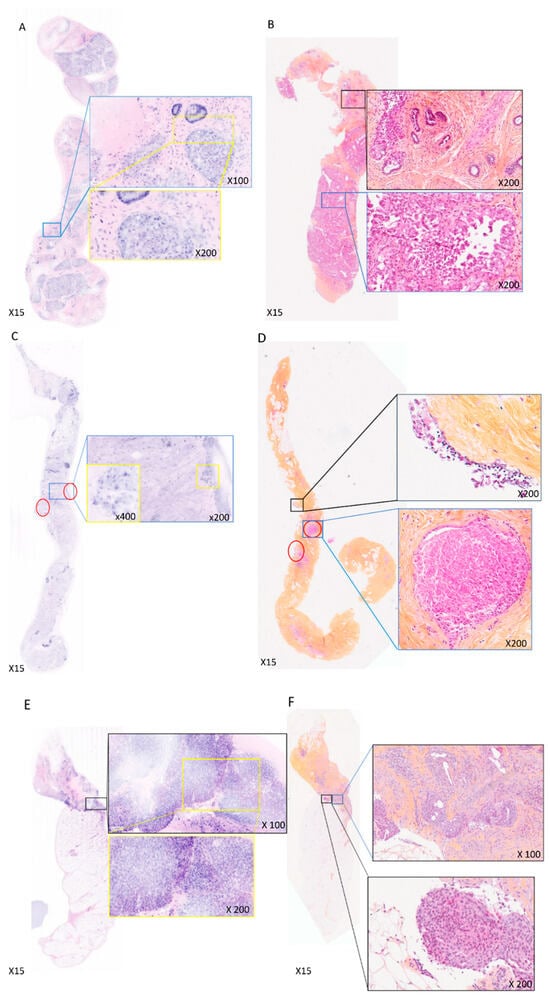 FCM images interpretation showed major discrepancies with the final diagnosis. (A). Fresh tissue—fibroadenoma with lactating metaplasia interpreted as DCIS by PT1. (B). FFPE tissue—corresponding HES section. (C). Fresh tissue—DCIS interpreted as suspicious by PT1 and as mastopathy by PT2. In red circles: clusters of suspicious cells observed by PT1. (D). FFPE tissue—corresponding HES section with the two ducts leading to the final diagnosis of DCIS circled in red. (E). Fresh tissue—complex sclerosing lesion interpreted as DCIS invasion by PT1 and as DCIS by PT2. (F). FFPE tissue—corresponding HES section.