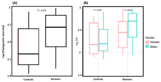 Alpha diversity was significantly higher in runners than controls (p = 0.04) (Figure 1). No difference in alpha diversity was observed between males and females in any of the groups.