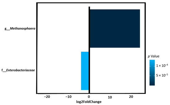 Taxonomic analysis of gut microbiota composition revealed a quantitative difference in bacterial types between the study groups. At the family level, runners showed a significantly lower abundance of Enterobacteriaceae than control subjects (log2FoldChange = −3.9, p = 0.0001). At the genus level, runners showed a significantly higher abundance of Methanosphaera (log2FoldChange = 24.01, p = 5.64 × 10−20) than the controls (Figure 2).