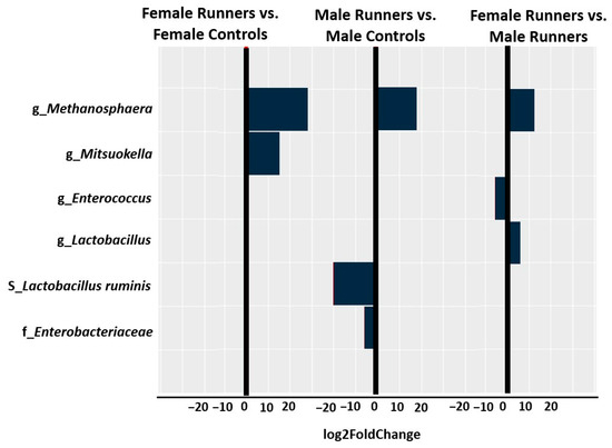 Male runners expressed a significantly lower abundance of Enterobacteriaceae (log2FoldChange = −5.7, p = 1.27 × 10−6) at the family level, a significantly higher abundance of Methanosphaera (log2FoldChange = 18.1, p = 2.03 × 10−6) at the genus level, and a significantly lower abundance of Lactobacillus_ruminis (log2FoldChange = −20.3, p = 8.99 × 10−9) at the species level compared with control group (Figure 3). In contrast, female runners showed a significantly higher abundance of Methanosphaera (log2FoldChange = 29.1, p = 1.68 × 10−8) and a significantly higher abundance of Mitsuokella (log2FoldChange = 15.8, p = 2.20 × 10−6) at the genus level (Figure 3) compared with controls. Compared to male runners, female runners showed a significantly lower abundance of Enterococcus (log2FoldChange = −5.8, p = 0.0007) but a significantly higher abundance of Lactobacillus (log2FoldChange = 6, p = 0.0005), and a significantly higher abundance of Methanosphaera (log2FoldChange = 11.7, p = 2.10 × 10−9) (Figure 3).