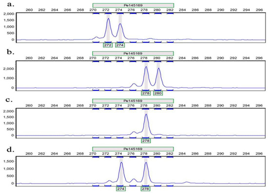 Amplification of some samples on primer Pe145169. The horizontal axis represents the size of the product (bp); The vertical axis represents the relative fluorescence signal; (a–d) represent four different samples.